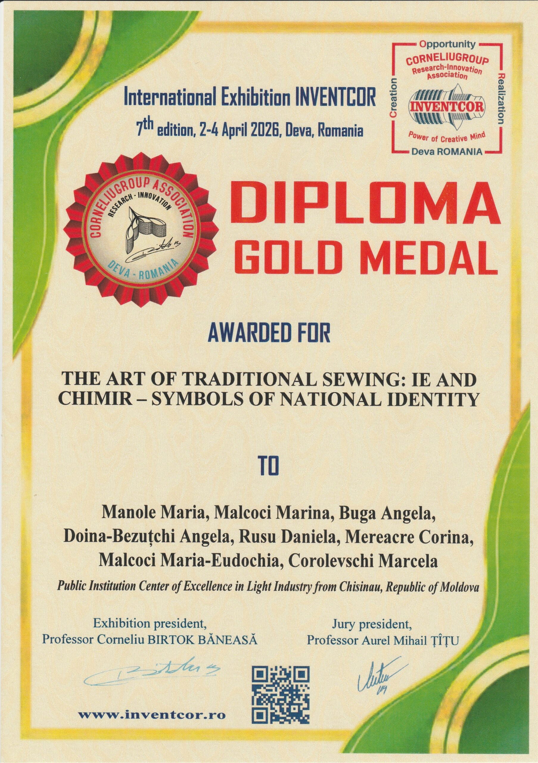 1. Medalia de Aur (Diploma Gold Medal): Oferită de asociația CorneliuGroup pentru originalitatea și excelența demersului.