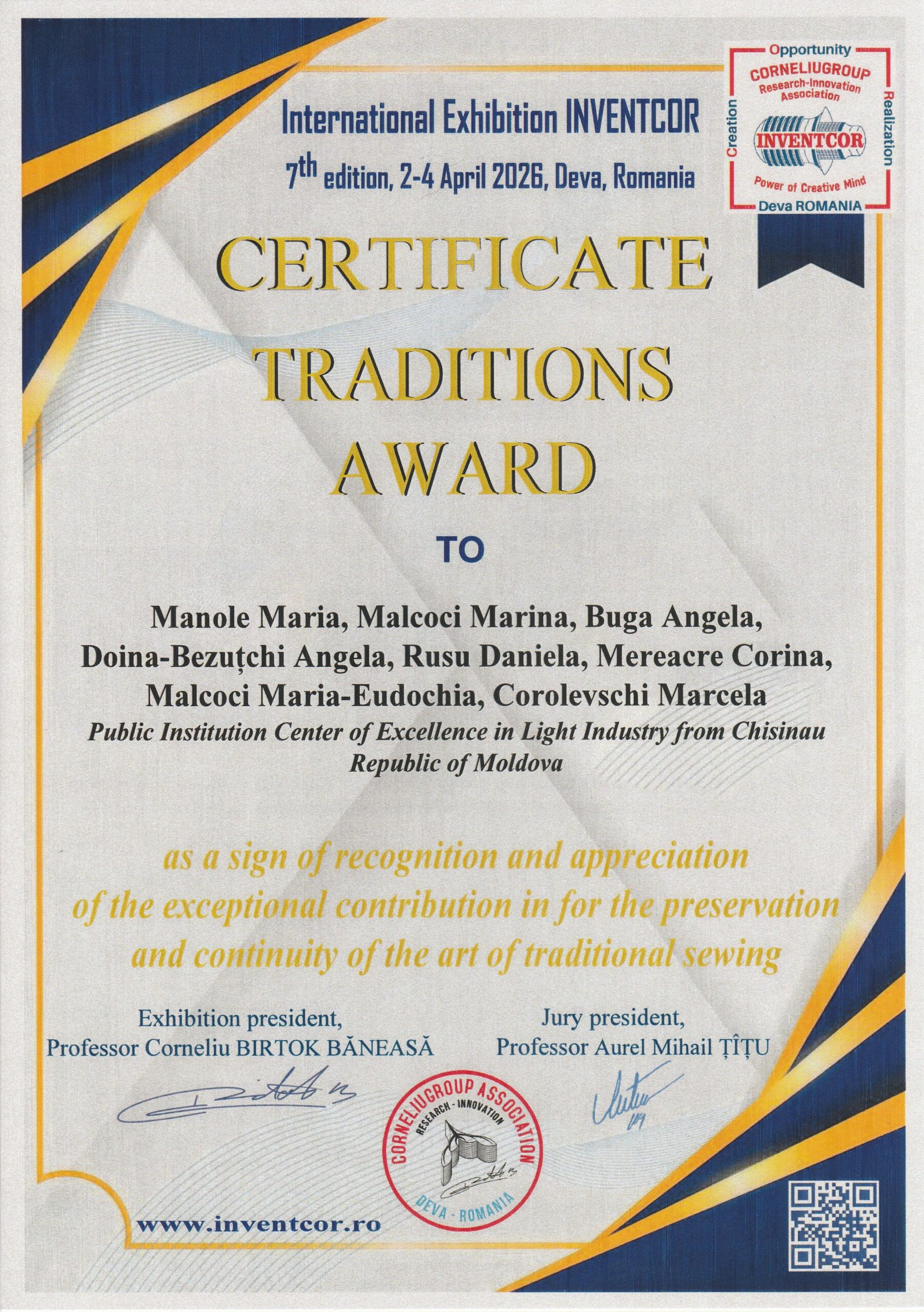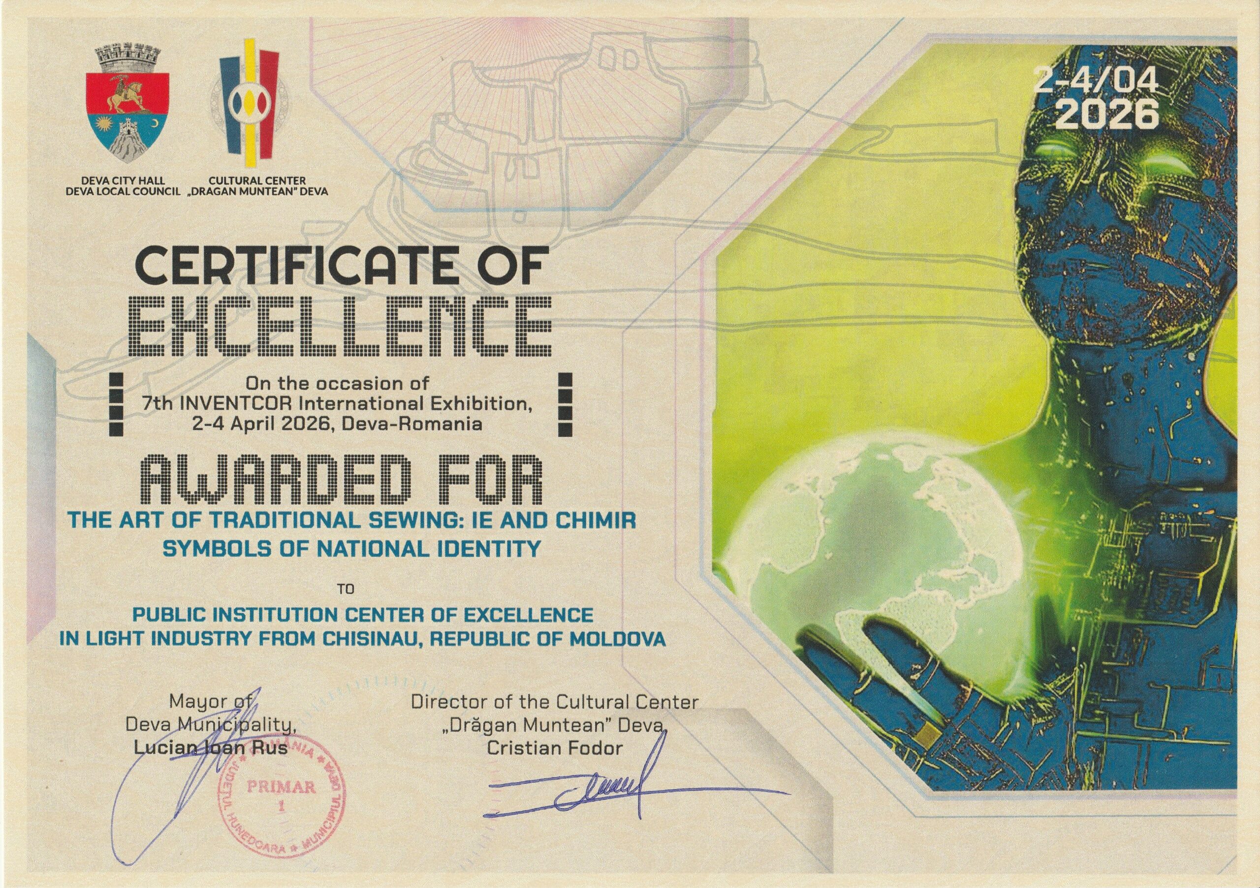 În perioada 2–4 aprilie 2026, orașul Deva, România, a găzduit cea de-a VII-a ediție a Expoziției Internaționale INVENTCOR. Pentru Centrul de Excelență în Industria Ușoară (CEIU) din Chișinău, participarea la acest eveniment a marcat un moment de vârf în promovarea creativității, inovației și a valorilor autentice ale patrimoniului cultural național.