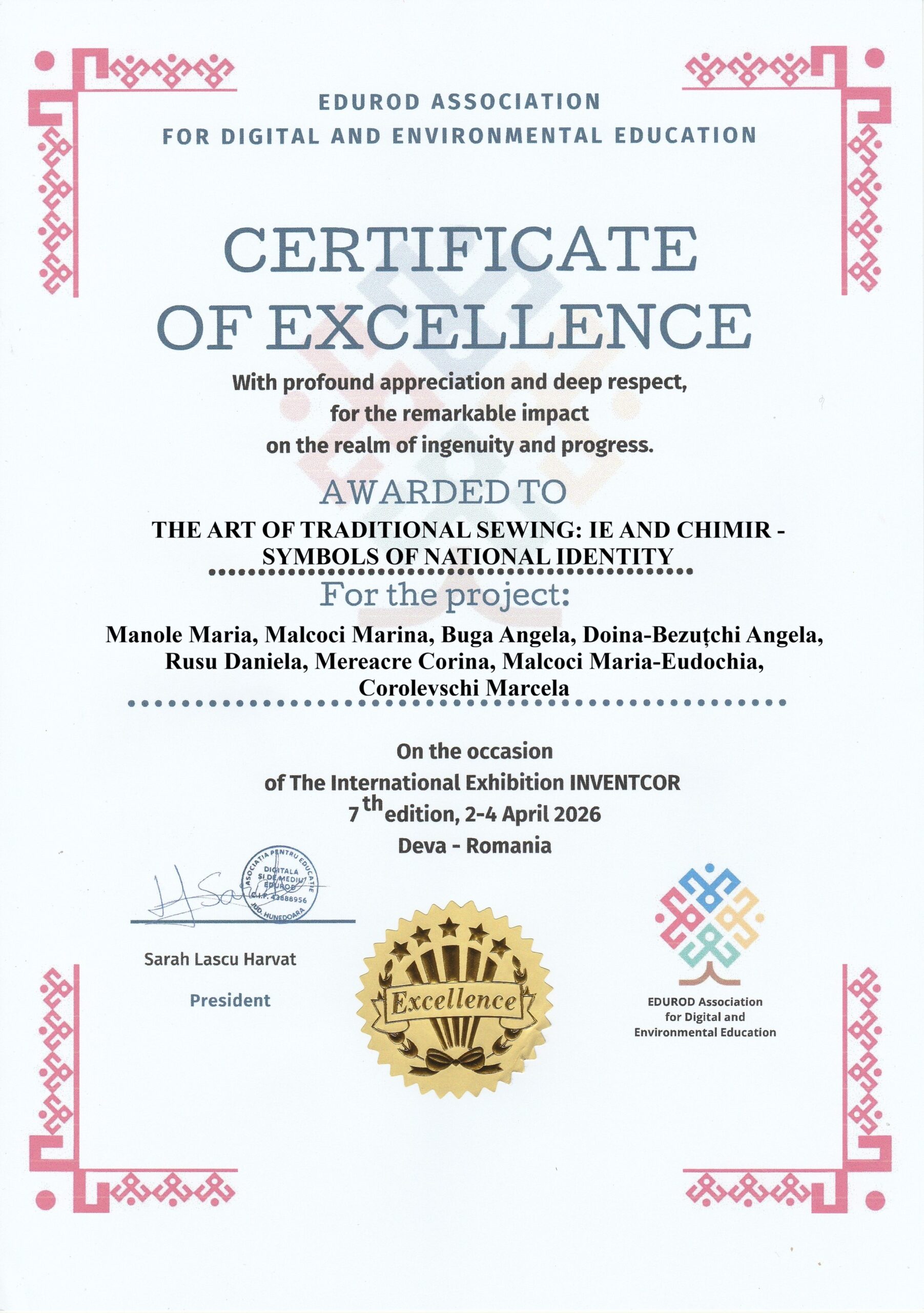 3. Certificate of Excellence (Asociația EDUROD): Pentru impactul remarcabil în domeniul ingeniozității și progresului.